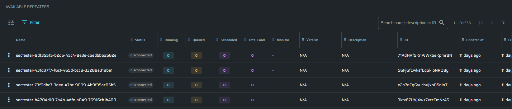 Runtime workload indicators have been added to the Repeater settings pages, showing queued, running, and scheduled executions per repeater, along with connectivity status and contextual tooltips.