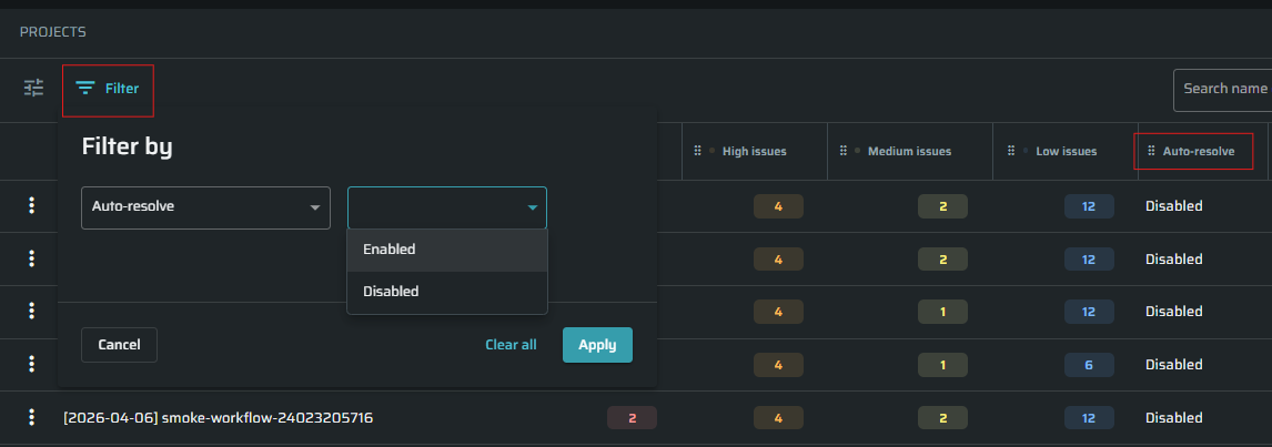 Users can now filter and sort projects based on their Auto-resolve status using a new column and filter options in project views.