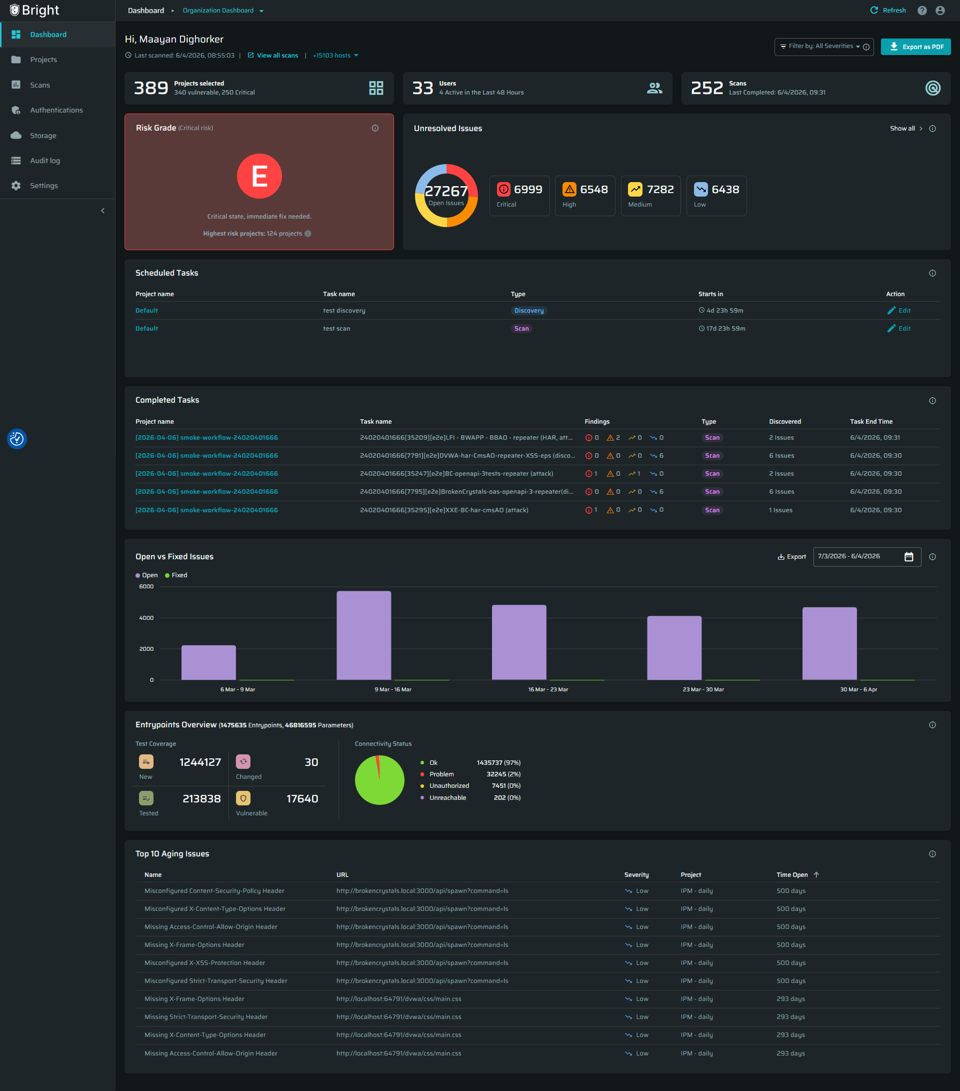 It includes a set of widgets that provide quick insights into project activity, overall security grade, unresolved vulnerabilities, remediation trends, scan execution, entrypoint coverage, and aging issues - helping you quickly identify risks and make informed decisions.