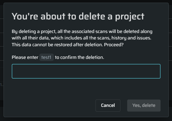 To prevent accidental deletions, we added a new confirmation step when deleting a project. Users are now required to type the full project name before deletion is allowed. The Delete button becomes active only when the name is entered correctly, ensuring safer and more deliberate project management.