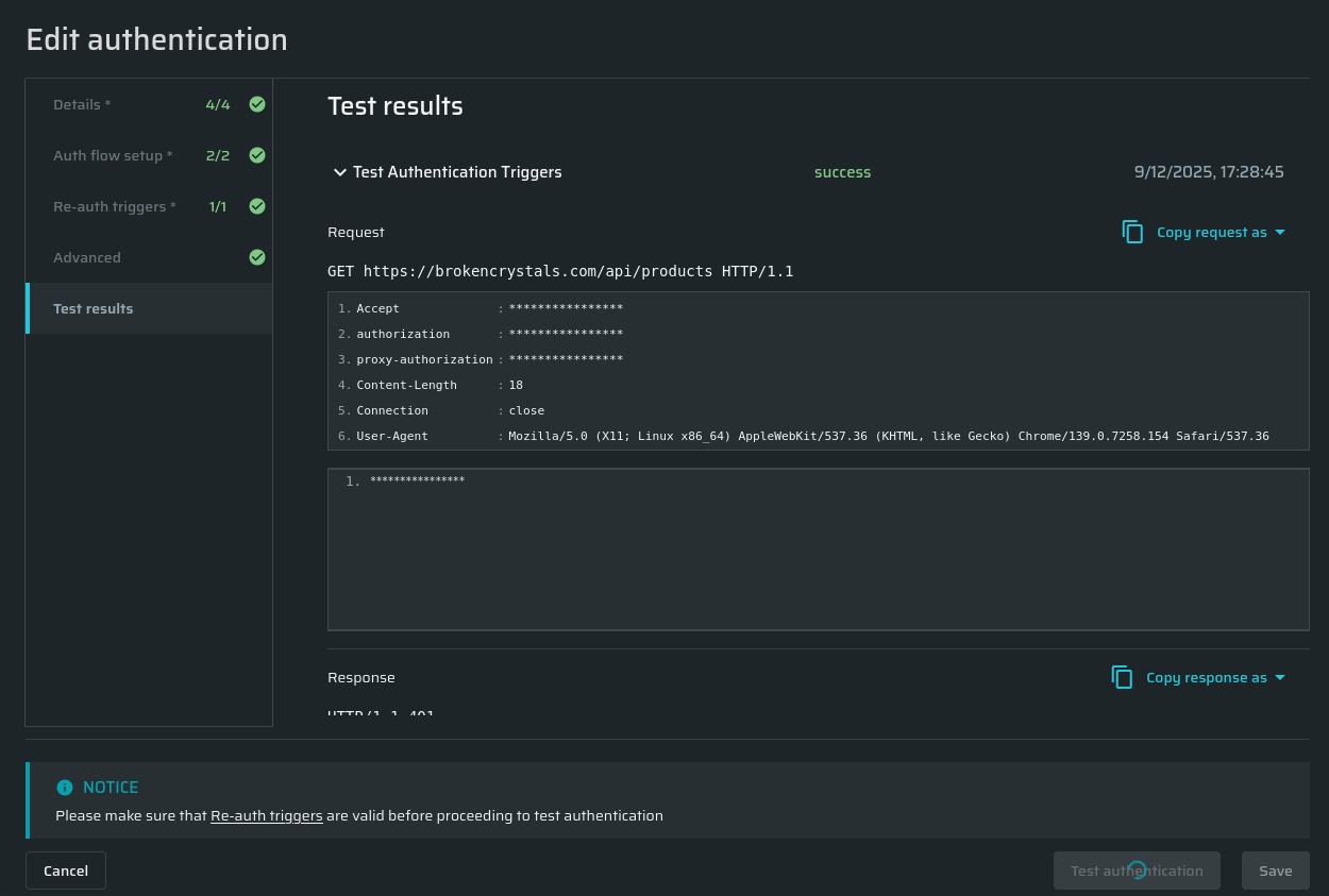 To improve data security, fields configured as masked in the authentication object are now automatically masked in the Test results tab. These values cannot be unmasked in the test results.