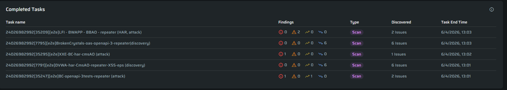 It displays the most recently completed scans and discoveries, including scan name, type, severity breakdown, total issues or entrypoints, and completion time.