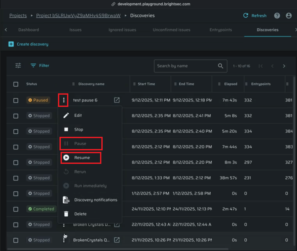 New action buttons let you pause and resume scans and discoveries, giving you more control over how and when scans run. Paused scans preserve their state for 7 days and can be resumed later. After 7 days, the status will change to "stopped" automatically.