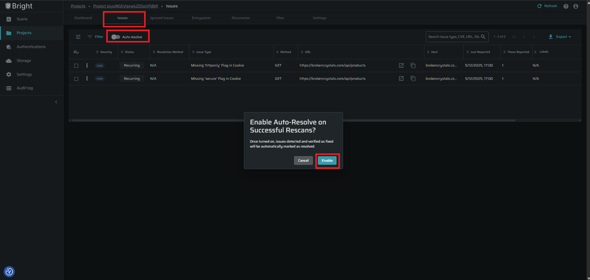 Vulnerabilities that no longer reproduce in consistent re-scans can now be automatically marked as resolved. This keeps dashboards, reports, and metrics accurate without requiring manual status updates.