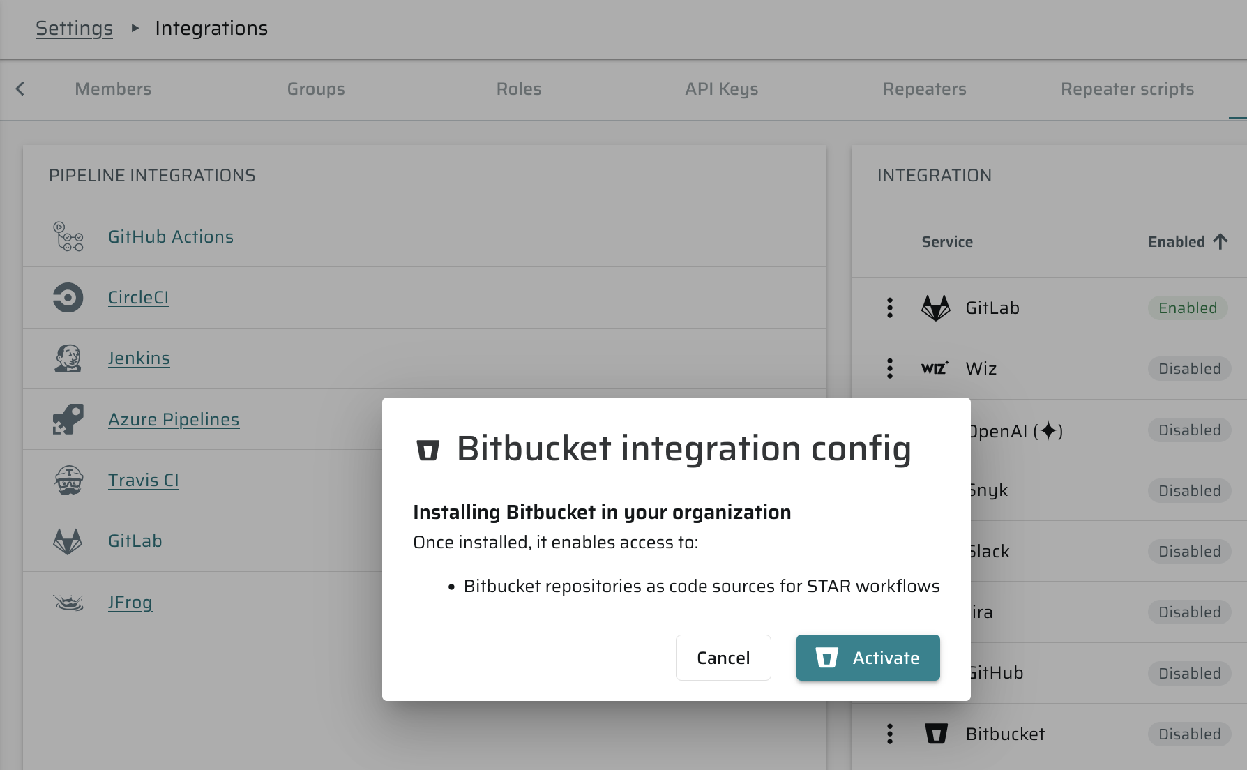 In the BitBucket Integration Configuration section, click ⋮ -> Settings -> Activate.