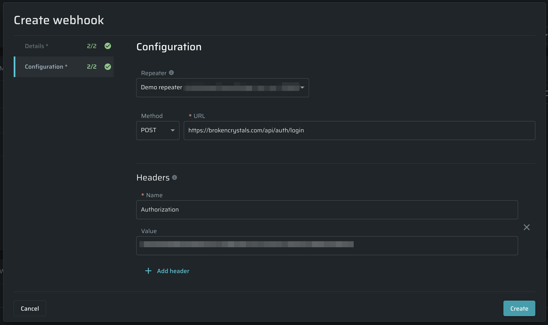 (Optional): From the Repeater dropdown list, select a Repeater you want to use when sending the JSON payload to the API endpoint.