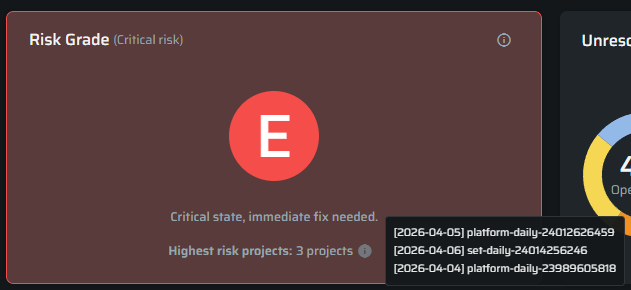 The grade reflects the worst (highest risk) project in the selected scope. Click the info icon in the widget to view the highest-risk projects.