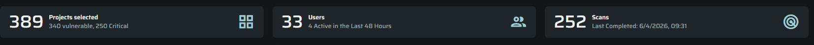 Projects - total selected projects, including how many are vulnerable or critical Users - total users and active users in the last 48 hours Scans- number of scans in the past 30 days and the last completed scan time