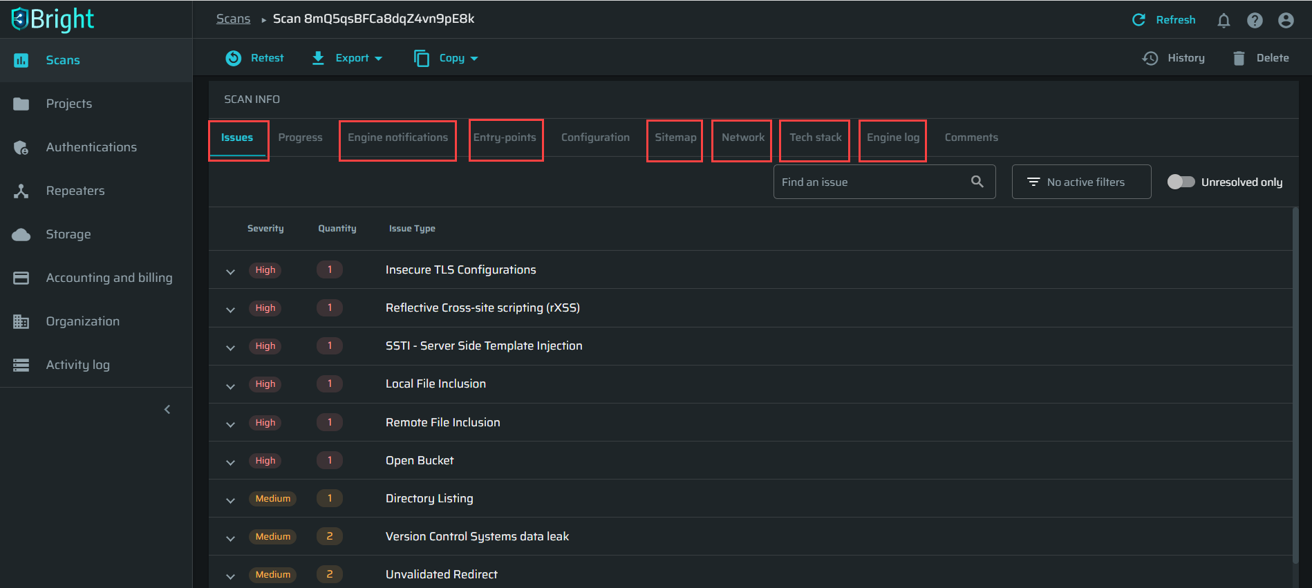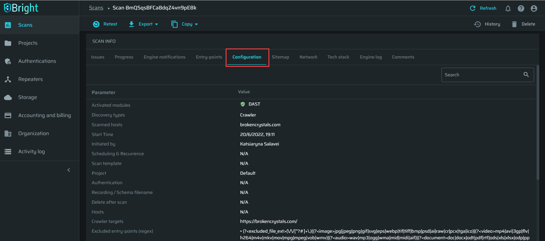 Bright allows you to monitor the scan progress, check the setup parameters and runtime notifications, as well as view the scan results. All these options are available for each scan selected on the Scans or Scans History page.