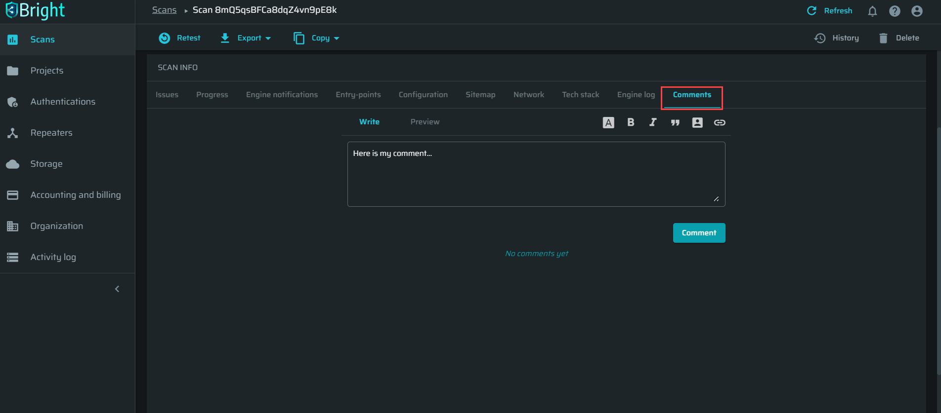The Comments tab enables you to add comments and notes describing the scan, notes for yourself, or notes for other members of your organization. You can format the comment using Markdown or the provided formatting tools. To mention other users in your organization, use the @ symbol.