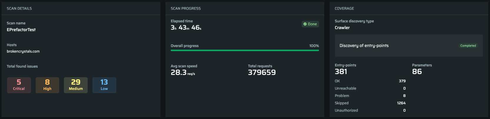 Shows the scan status, the scan duration (till the moment, or overall if completed), average scan speed, as well as the total and successful requests. The overall progress is based on the percentage of completed tests. You can check how many tests have already been completed and how many still remain in the Progress tab of the SCAN INFO section. This module also contains the information about a time saved by a parallel testing, which usually performed during a high-concurrency tests. - COVERAGE
